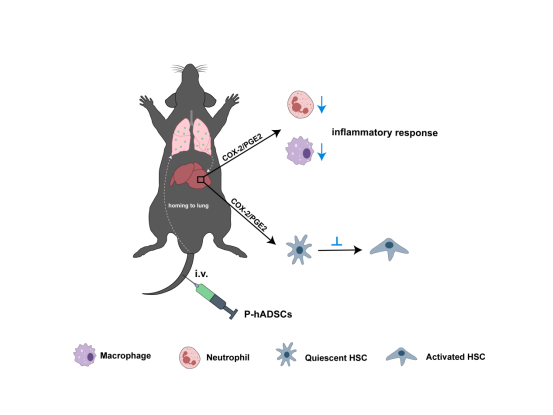 在该研究中,使用炎症因子TNF-α和IL-1β对hADSCs预处理,通过尾静脉注射到小鼠体内,以探究其在胆汁淤积性肝损伤中的治疗效果及作用机制。该研究发现,TNF-α/IL-1β预处理可显著下调hADSCs免疫原性相关基因的表达并提高其体内移植存活率。此外,TNF-α/IL-1β预处理显著增强了hADSCs对胆汁淤积性肝损伤的治疗效果,且肝组织炎症反应及肝星形细胞活化受到明显抑制,肝损伤及肝纤维化进程得到有效改善。机制上,TNF-α/IL-1β预处理上调hADSCs中COX-2表达和PGE2分泌,而COX-2沉默逆转了TNF-α/IL-1β预处理hADSCs的积极效果。这些结果表明TNF-α/IL-1β预处理可能通过COX-2/PGE2途径增强hADSCs在胆汁淤积性肝损伤小鼠中的疗效。