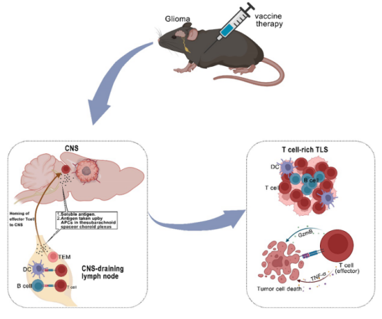 神经胶质瘤是一种高度恶性的侵袭性脑肿瘤,并伴随着较差的预后和低生存率,临床仍旧缺乏有效的治疗方法。然而人类巨细胞病毒(HCMV)即刻早期蛋白1 (IE1)在GBM组织中的高表达与其恶性进展密切相关,这为治疗胶质瘤提供了新的靶点。在此,我们利用原核表达系统开发了两种以IE1为靶点的治疗性胶质瘤疫苗IE1和IE1突变蛋白并成功构建了原位胶质瘤模型,进行了疗效研究。研究结果表明治疗性接种IE1或IE1mut可有效调动和刺激外周免疫器官和中枢神经中的免疫细胞,从而促进胶质瘤内三级淋巴结构(TLS)的形成,并促进体内免疫细胞的增殖及分化发育。进而诱导肿瘤消退,最终延长了胶质瘤模型小鼠的生存期。该研究为治疗胶质瘤设计肿瘤疫苗提供了一个可行的靶点,给临床治疗胶质瘤提供一个新的方法,为胶质瘤治疗后中枢及外周免疫的激活提供了新的见解。