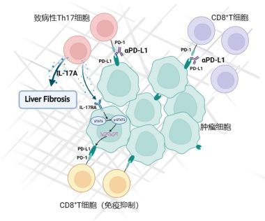 该研究应用抗PD-L1抗体治疗肝癌小鼠并研究其耐药机制。动物实验结果显示,抗PD-L1抗体治疗后肝癌小鼠肿瘤组织中pTh17细胞浸润增多,IL-17A分泌增多,纤维化程度加重。进一步研究发现,抗IL-17A抗体和抗PD-L1抗体联合应用治疗肝癌小鼠显著抑制肝癌生长,改变肿瘤免疫抑制微环境,提高免疫检查点抑制剂的治疗效果。体外实验表明,IL-17A通过促进肝癌细胞中STAT3磷酸化上调PD-L1的表达来促进肝癌的免疫逃逸。上述发现阐明了肝癌对抗PD-L1抗体免疫治疗耐受的机制,验证了靶向IL-17A对肝癌的抗PD-L1抗体治疗增敏的可行性。本研究将为临床肝癌的治疗提供一种有前途的策略。