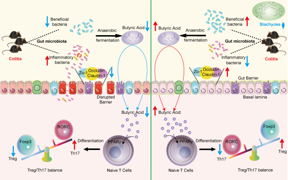 溃疡性结肠炎是一种复杂的慢性炎症性疾病,与肠道内稳态功能障碍密切相关。以前的研究表明,水苏糖作为一种功能性食品添加剂,具有增强肠道健康和缓解UC症状的潜力。然而,其作用的潜在机制尚不清楚。在本研究中,我们的研究结果表明,在DSS诱导的结肠炎小鼠中,膳食补充水苏糖对结肠炎症状、调节肠道微生物群和恢复Treg/Th17细胞平衡具有显著的剂量依赖性保护作用。为了进一步验证这些发现,我们进行了粪便微生物群移植治疗DSS诱导的小鼠结肠炎。结果表明,与对照组相比,水苏糖处理小鼠的微生物群对结肠炎表现出优越的治疗效果,并有效调节Treg/Th17细胞平衡。此外,水苏糖的补充和FMT均增加了丁酸盐的产量和PPARγ的激活。然而,这种作用被PPARγ拮抗剂GW9662部分减弱。这些结果表明,水苏糖通过调节肠道微生物群和激活PPARγ来缓解UC症状。