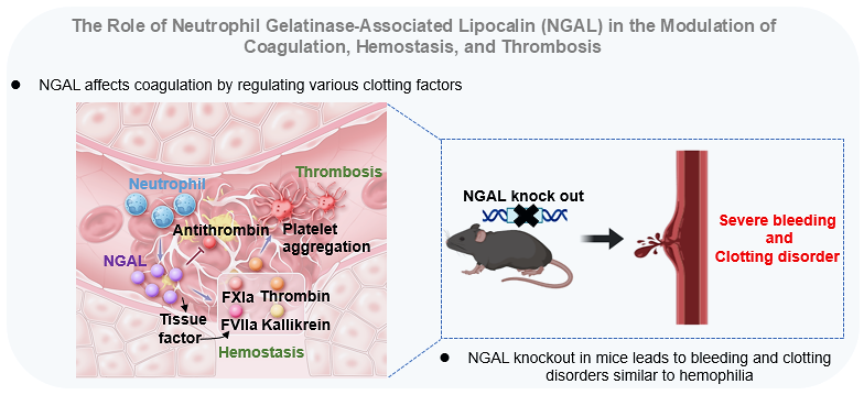 凝血与炎症密切相关,但先天免疫系统与凝血调节的关键通路仍不完全清楚。该研究显示,在深静脉血栓患者的血浆中,先天免疫炎症介质中性粒细胞明胶酶相关载脂蛋白(NGAL)水平上升。NGAL通过增强细胞表面组织因子表达、增强多种凝血因子(如凝血酶、激肽释放酶、FXIa和FVIIa)催化活性、促进凝血酶诱导的血小板聚集以及抑制抗凝血酶来实现其对凝血、止血和血栓形成的启动和放大。在NGAL敲除的小鼠中,血栓弹力图谱分析显示凝固和反应时间显著延长,血栓凝固角和最大振幅降低,这与活化部分凝血活酶时间和凝血酶原时间的显著延长相一致。在多种小鼠止血和血栓模型中,NGAL过表达或静脉注射促进了凝血和止血,增加了血栓形成,而NGAL敲除或使用抗NGAL单克隆抗体处理则显著延长了出血时间并减少了血栓形成。值得注意的是,敲除NGAL可将小鼠尾部的出血时间或颈动脉闭塞时间延长至40分钟或60分钟以上,类似于血友病小鼠中严重的出血和凝血功能障碍。此外,抗NGAL单克隆抗体干预显著减少了由角叉菜胶诱导的小鼠尾部血栓形成,而这一模型与炎症密切相关。