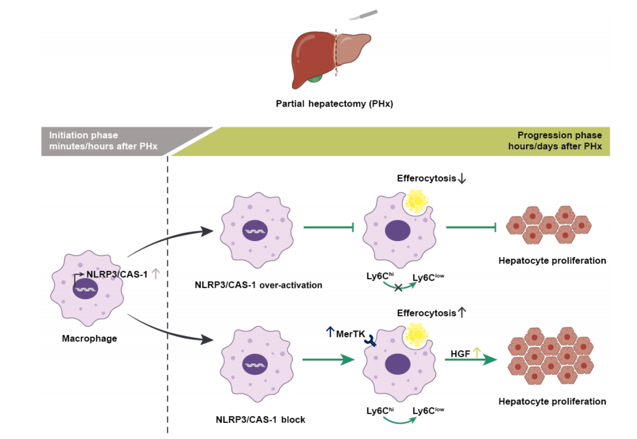 该研究证实,在70%部分肝切除(PHx)小鼠模型中,NLRP3 炎症小体在肝脏再生的早期被高度激活,显著影响肝脏再生能力。全身性 NLRP3 基因敲除(Nlrp3-/-)或药理学抑制显著提高了肝脏再生效率,而NLRP3过表达则严重抑制肝再生。此外,髓系特异性Nlrp3基因敲除小鼠(Nlrp3△mye)而非肝细胞特异性敲除(Nlrp3△hep)显示出显著增强的肝脏再生能力,提示巨噬细胞中NLRP3在肝再生中起到重要调节作用。进一步结合bulk RNA-seq和单细胞RNA测序(scRNA-seq)分析的机制研究发现,NLRP3通过抑制MerTK介导的凋亡细胞清除(efferocytosis),抑制巨噬细胞向修复性Ly6Clo表型的转化,从而限制肝脏再生。另外,在高脂饮食诱导的非酒精性脂肪性肝病(NAFLD)模型中,NLRP3活性显著升高,导致肝脏再生受损。使用经典NLRP3抑制剂MCC950可有效恢复肝脏再生并改善肝功能。这一研究首次系统性阐明了NLRP3炎症小体通过调控巨噬细胞凋亡细胞清除和表型转换限制肝脏再生的分子机制,为术后肝功能不全的患者提供了潜在的治疗新靶点。