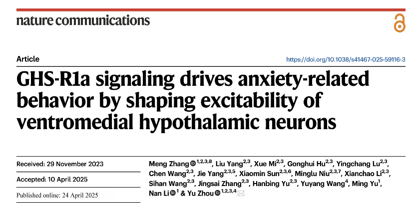 生理学专业2020级博士研究生张萌以第一作者在Nature Communications(IF=14.7,中科院1区top)发表题为“GHS-R1a signaling drives anxiety-related behavior by shaping excitability of ventromedial hypothalamic neurons.”的研究论文,男同性恋av