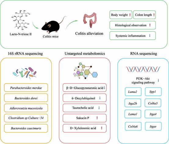 溃疡性结肠炎(UC)是一种常见的慢性炎症性肠病,主要表现为肠道屏障功能受损、免疫调节紊乱及肠道菌群失衡,给患者生活质量带来严重影响,临床亟需安全有效的治疗手段。此次研究针对性探讨了人乳寡糖LNT II对溃疡性结肠炎的治疗效果及内在机制。研究结果显示,LNT II能显著改善溃疡性结肠炎的病理损伤,有效修复受损的肠道上皮屏障,同时对机体的炎症反应起到精准调控作用。在肠道微生态层面,LNT II可逆转结肠炎引发的菌群失调及其肠道菌群代谢物。通过整合多组学分析技术,揭示了LNT II治疗溃疡性结肠炎的作用机制:LNT II首先重塑肠道菌群结构,进而调控肠道菌群代谢物的产生,最终通过抑制PI3K-Akt通路实现抗炎效果。这一机制清晰阐明了LNT II对“菌群-代谢物-免疫”网络的系统性调控作用。该研究为LNT II成为新型益生元疗法提供了全面的实验证据,不仅拓展了母乳成分的医学应用价值,也为溃疡性结肠炎的治疗提供了更安全、更具针对性的新选择。相关成果有望为慢性炎症性肠病的临床治疗带来新的突破。